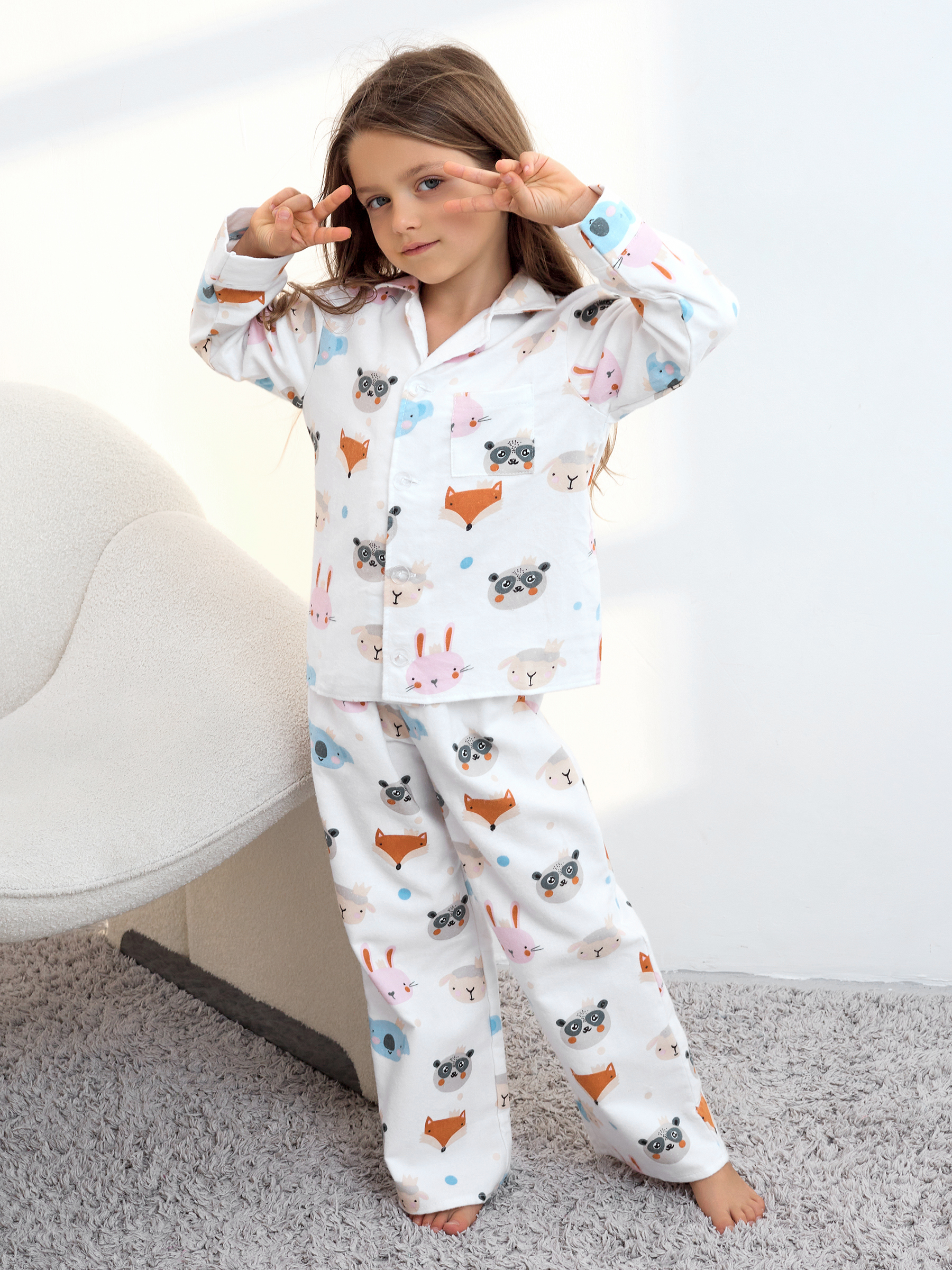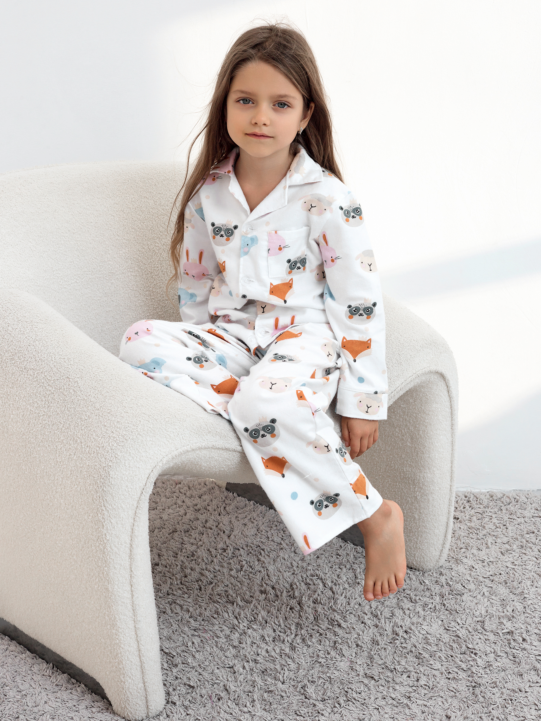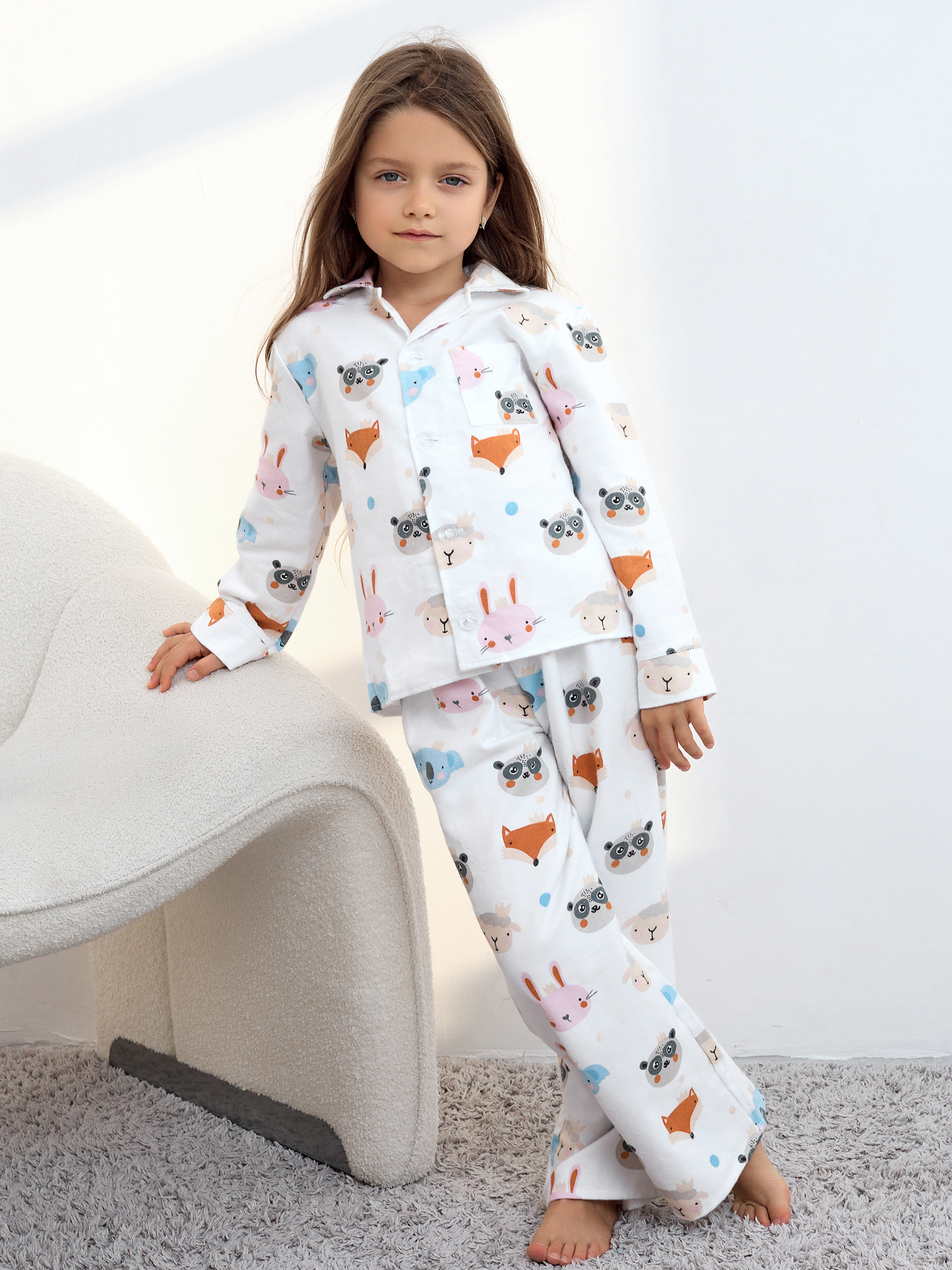Пижама детская свободного кроя не будет стеснять движения во время активных, а также спокойных игр дома, состоит из длинных свободных штанов на резинке и рубашки с длинным рукавом на пуговицах.