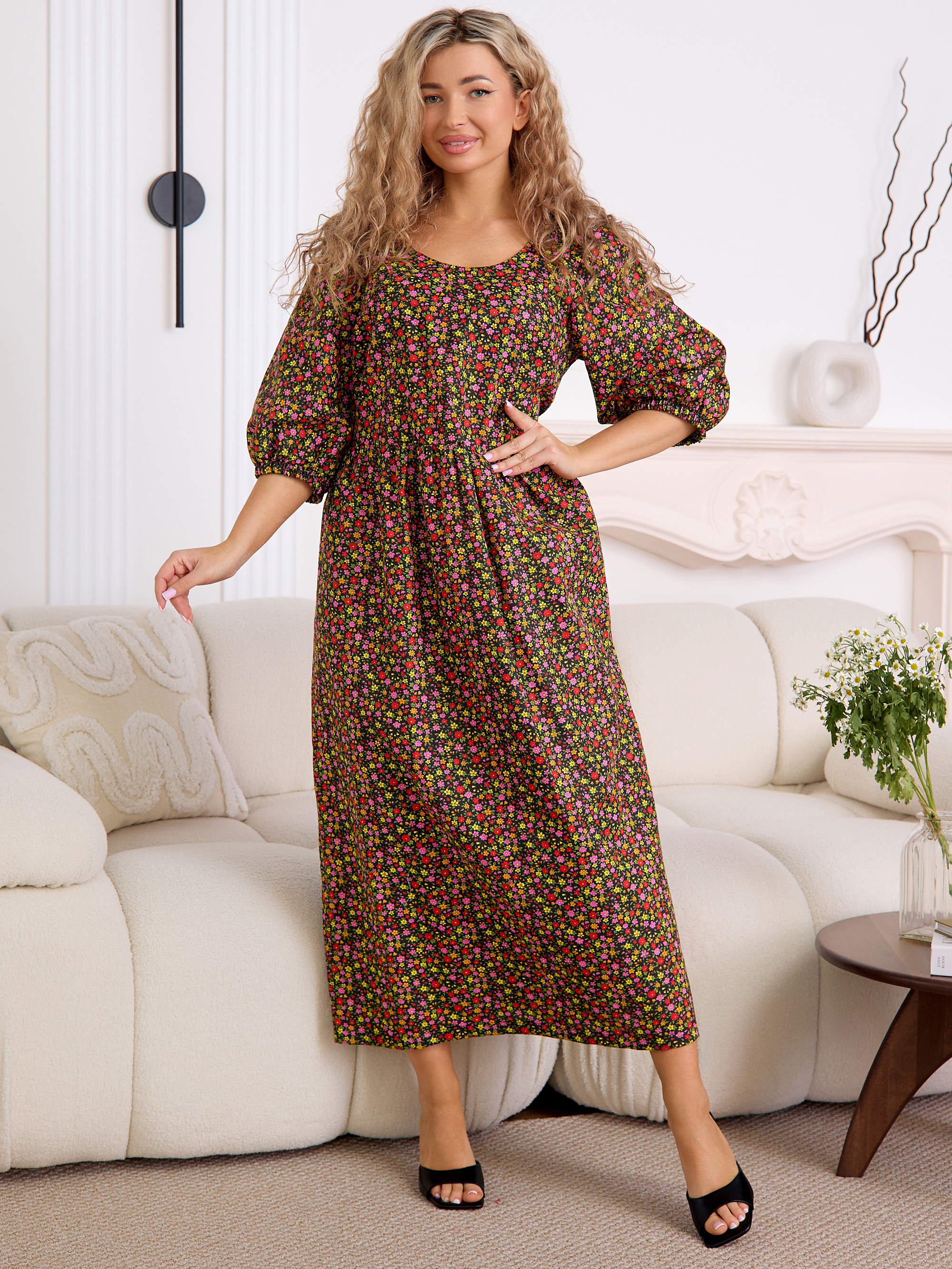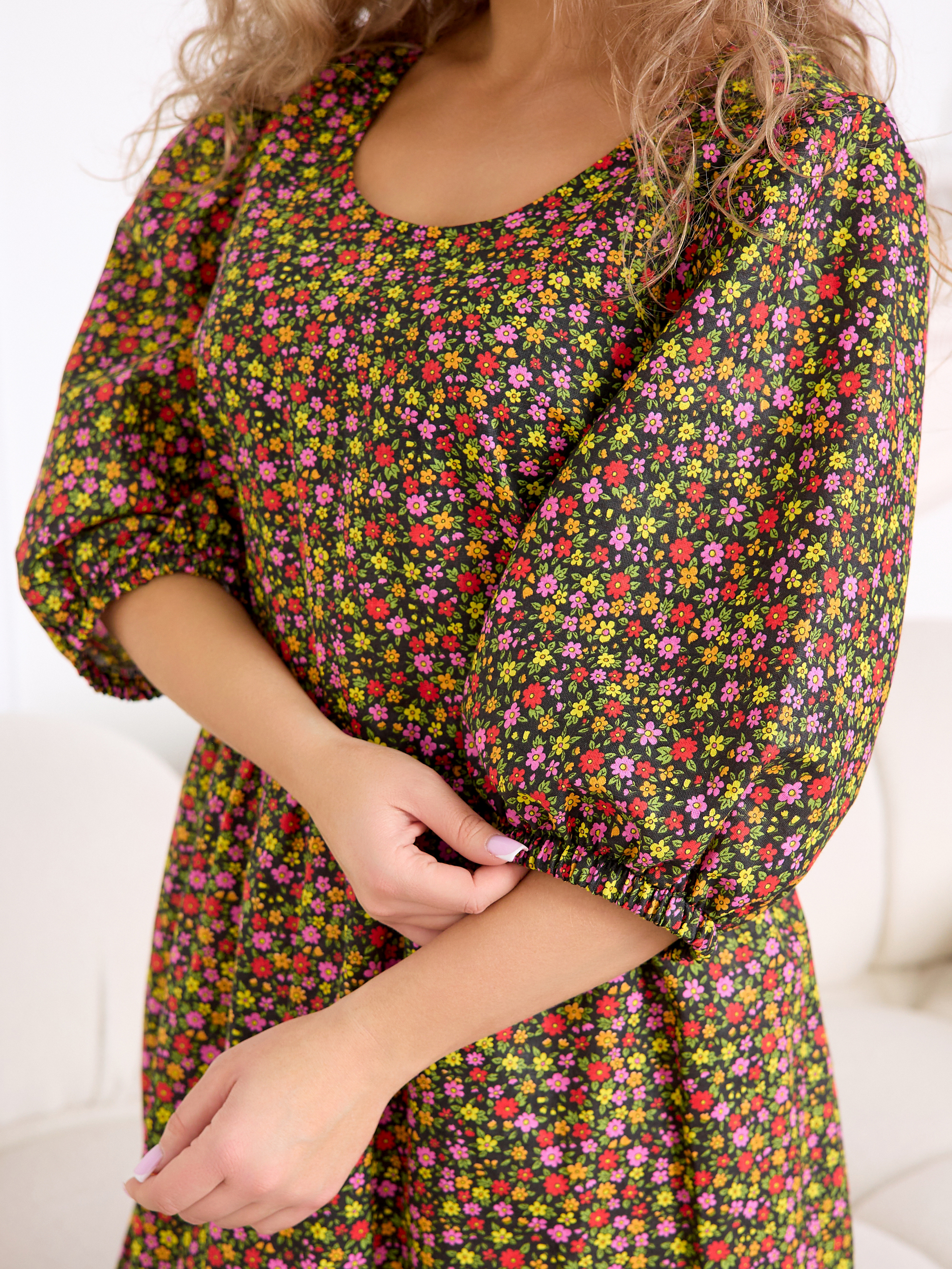 Рукав 3/4 с резинкой внизу — практичная и стильная деталь, которая завершает образ в духе «платья-крестьянки».