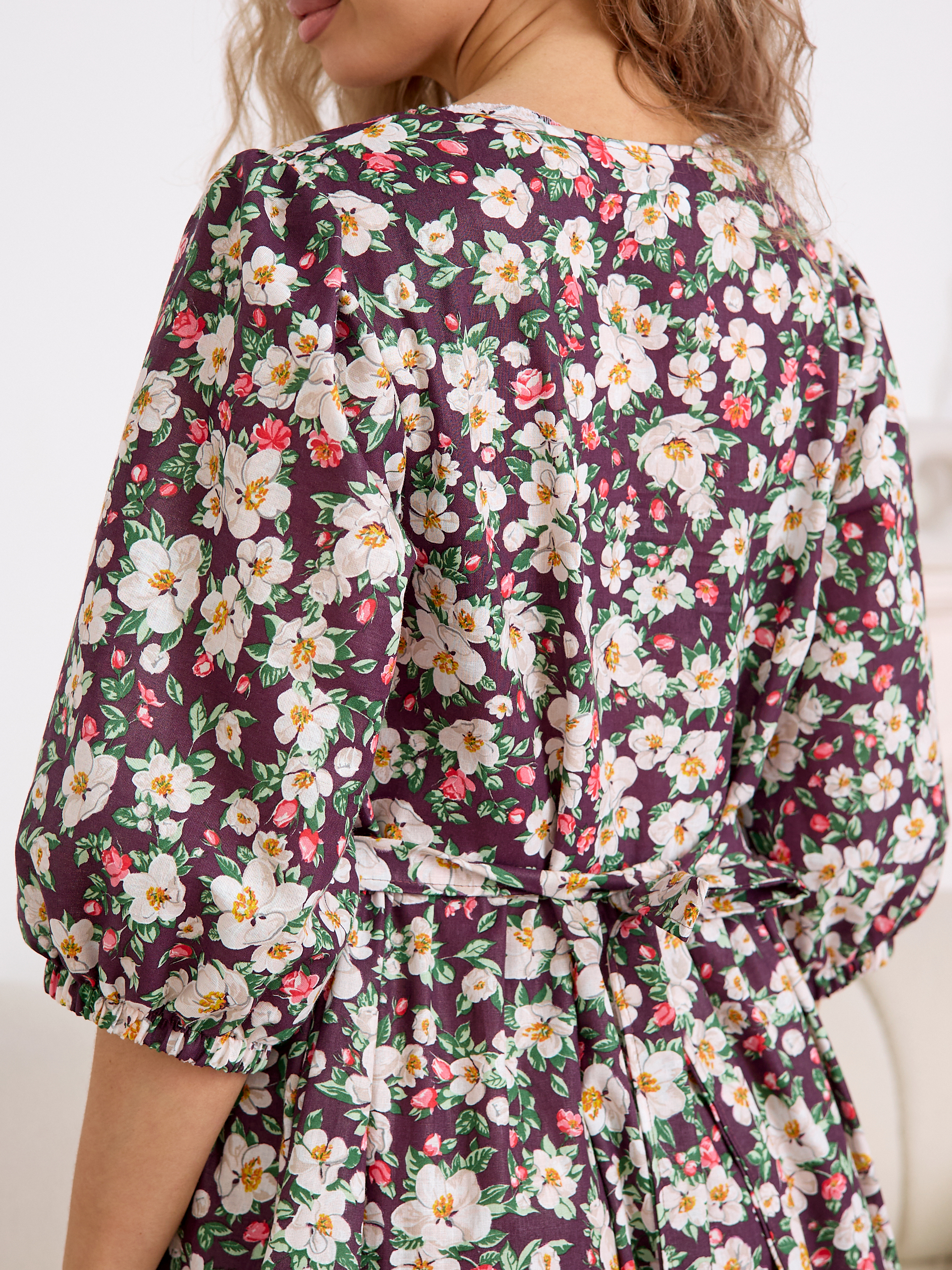 Рукав 3/4 с резинкой внизу — практичная и стильная деталь, которая завершает образ в духе «платья-крестьянки».